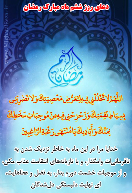 باقرآنت دیدگان مرا روشــــن کن و به وسیله قرآن سـینه مرا بگشـــا، دلم را شاد کن ،زبانم را باز کن ، بدنم را بوسیله آن به کار گیر، با آن مرا نیرومند ساز، با قرآن مرا یاری کن ،زیرا یاوری در قرآن جز تونیست جز توکسی شایسته پرستش نیست.